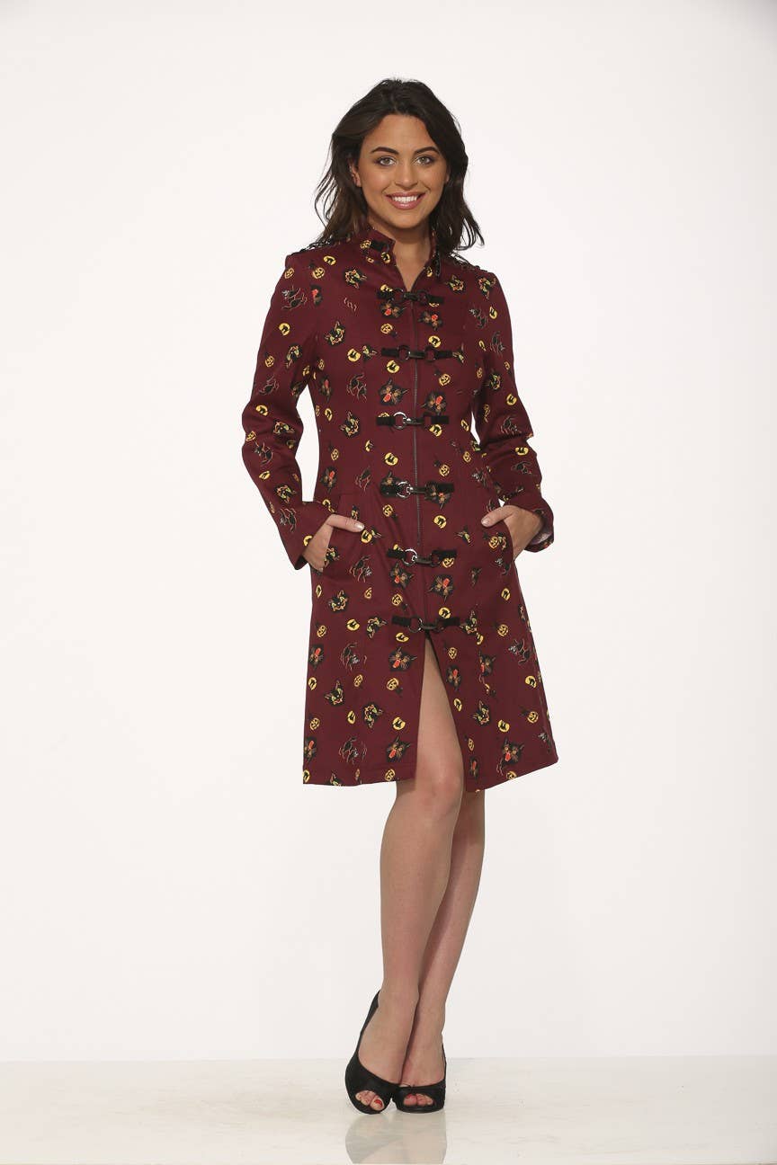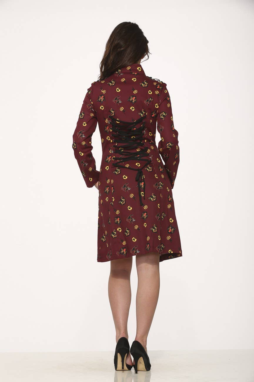 Meeoowww! Hearts & Roses' new Strait Jacket in Halloween Kitty Print will have people all in awe! Tough-as-nails lightweight jacket comes with functional chrome buckles that are not there only for looks purposes. This new hand-drawn in-house print consists of vintage black cats and moons with vintage pumpkins in a lovely dark burgundy shade. She is perfect for Halloween and also for any cat lovers.
