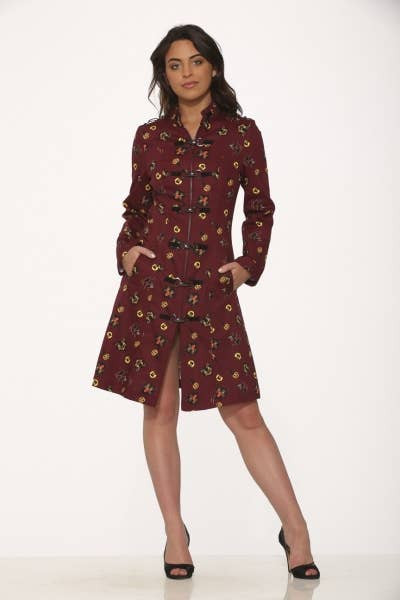 She has chrome buckles not only near the front zip but also at the high collar and the shoulders. She comes with side slash pockets and a slim and comfortable fit. The back of the jacket has corset-style lacing so you can lace it for a perfect fit. The length of this magical coat is roughly above the knee.