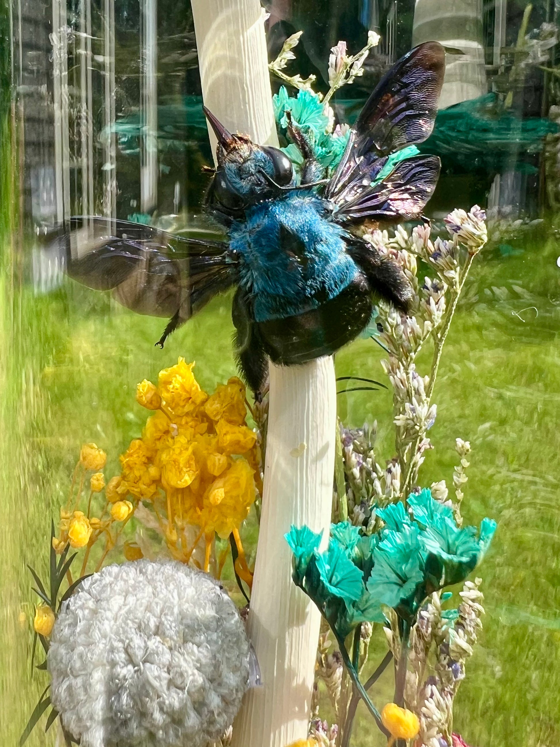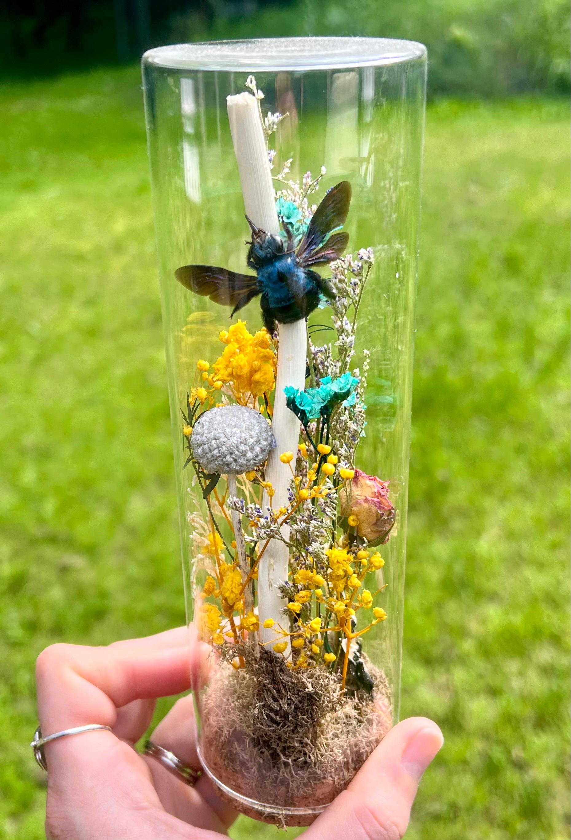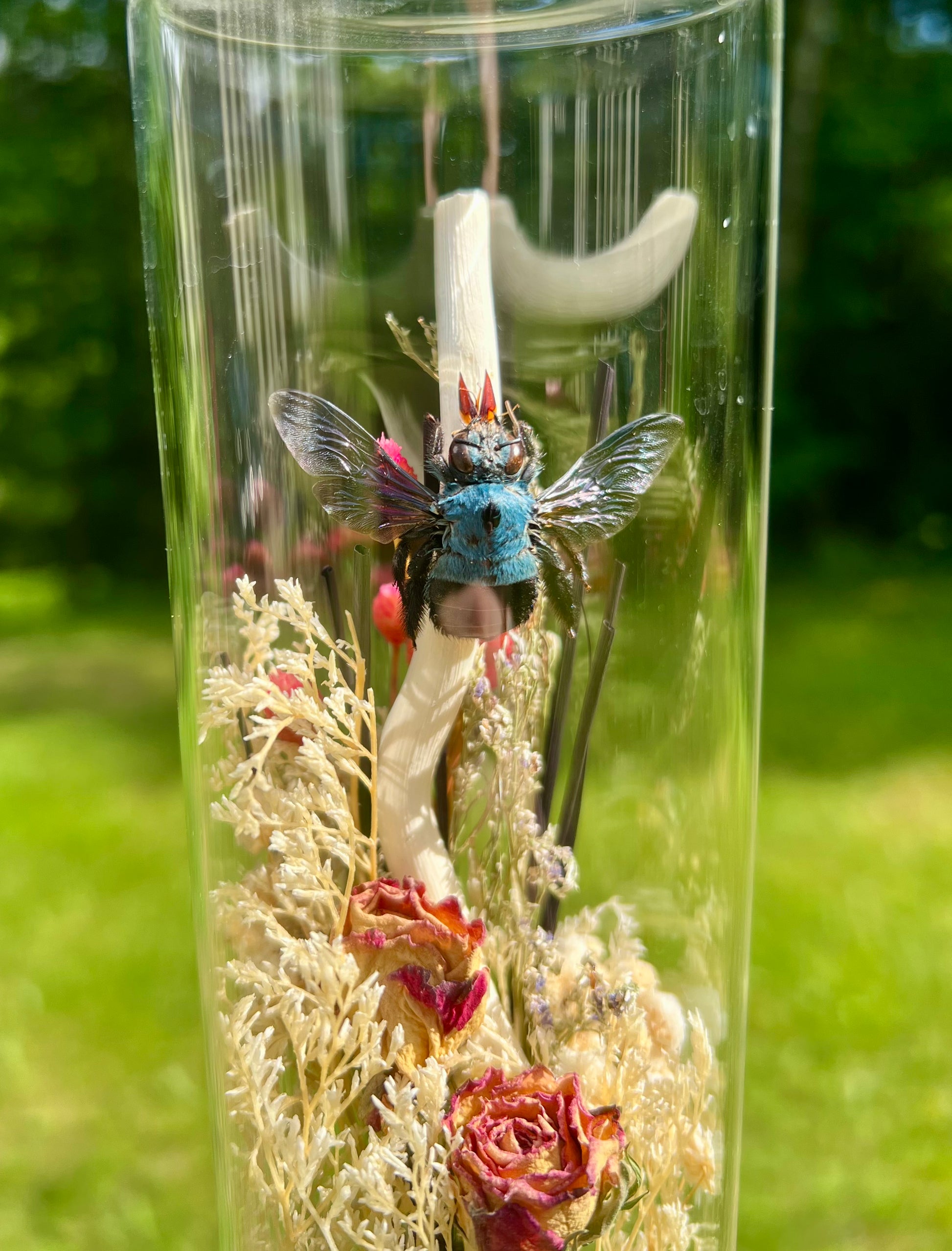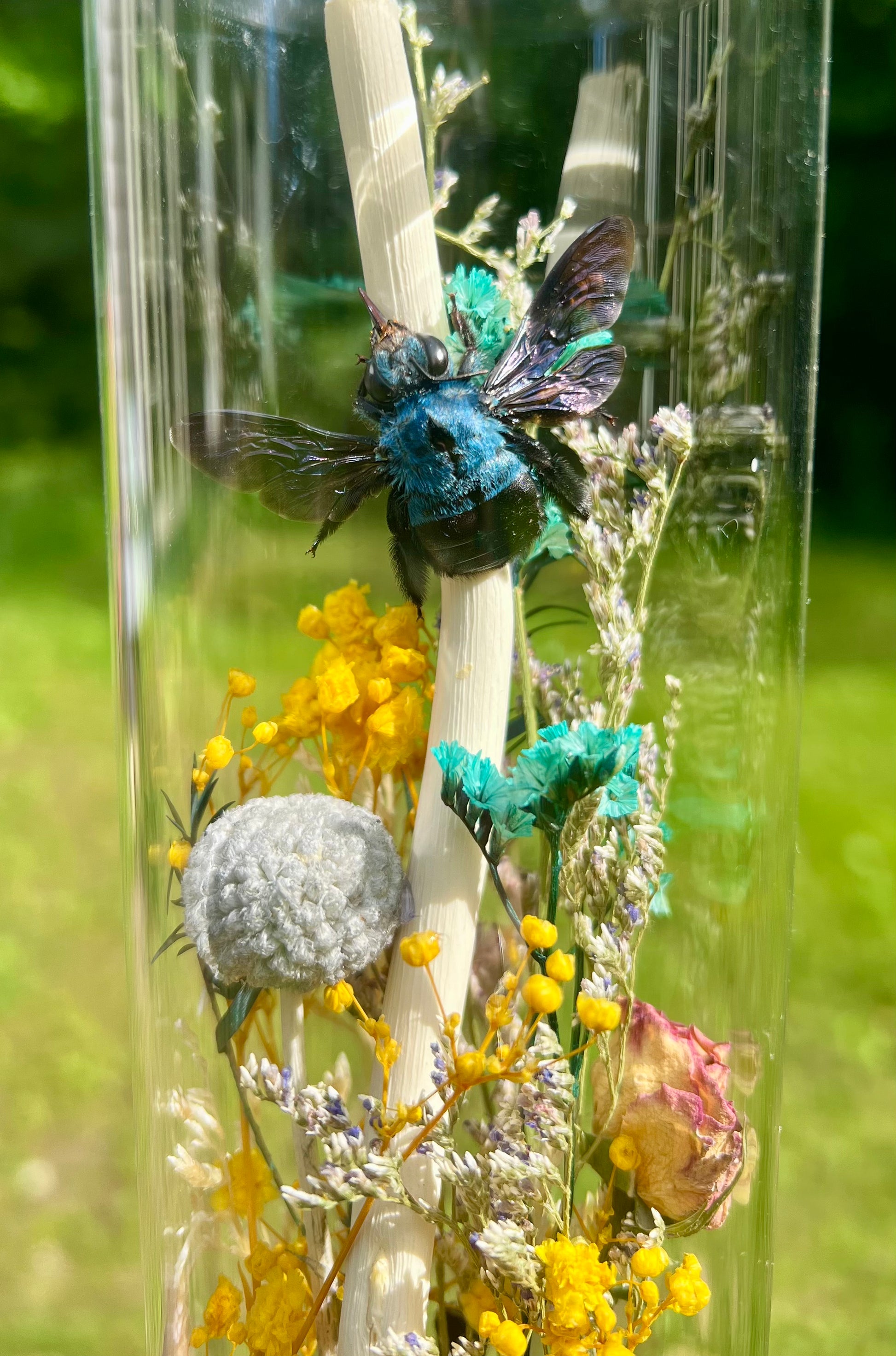 This unique piece of home decor features a real blue carpenter bee preserved in a glass jar with delicate dried flowers. A must-have for nature lovers, this oddity adds an intriguing touch to any space. Perfect for those looking for a one-of-a-kind conversation starter.