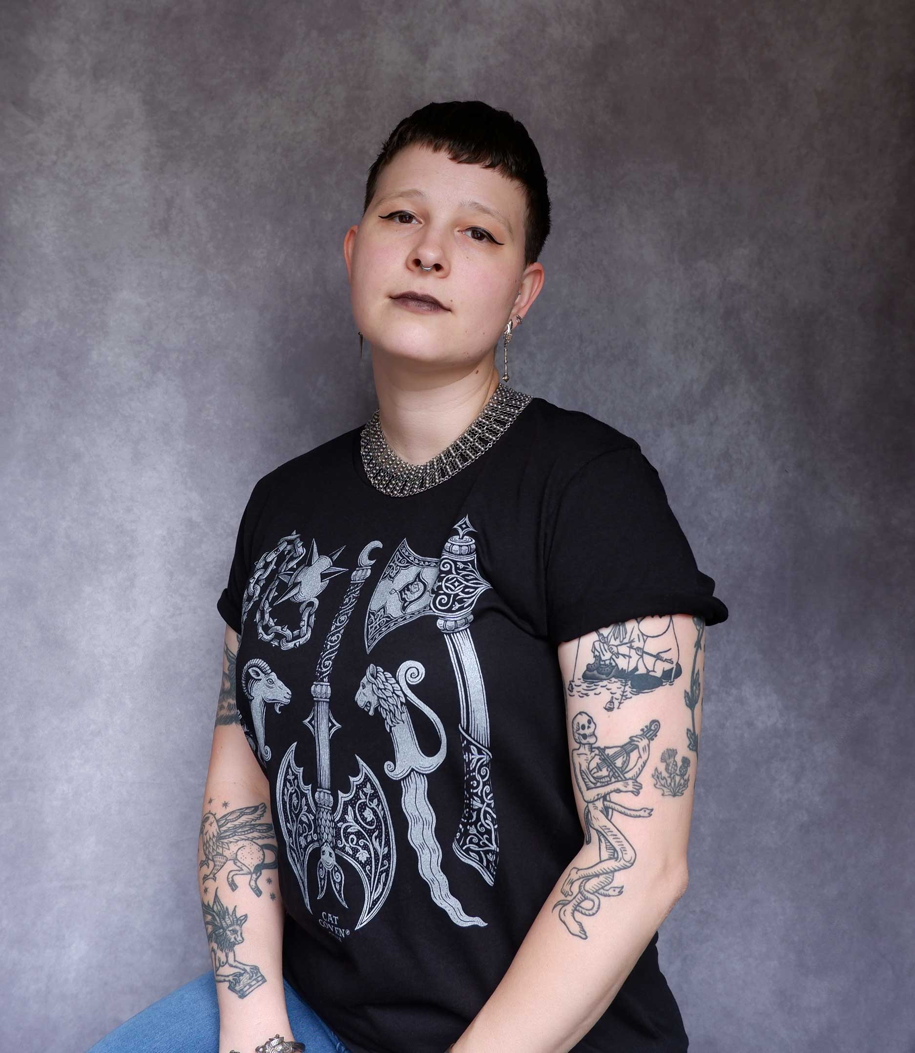 This illustration by Cat Coven was inspired by historical weapons as well as fantastical ones. Perfect for those who love video games, D&D and the Ren Faire! ⚔️ Features shimmery silver ink!