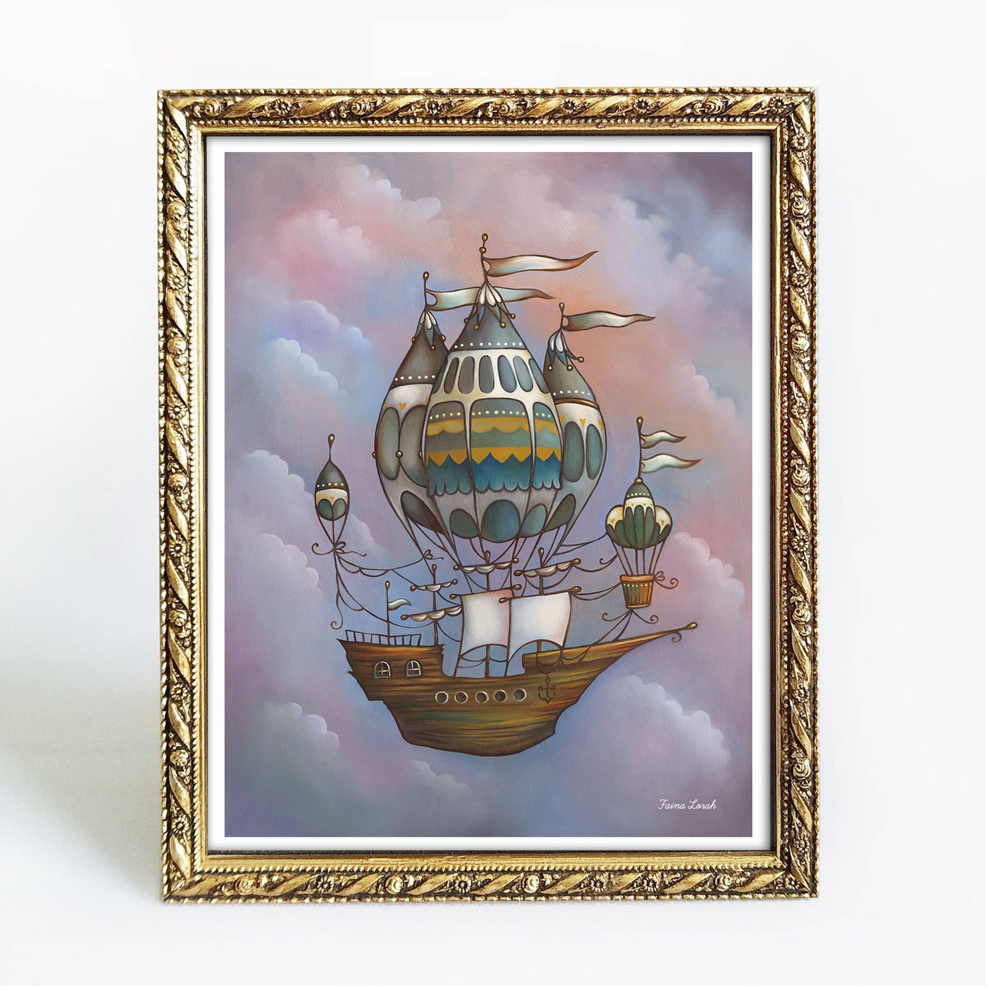 Cloud Sailing was originally made by Russian-born artist Faina Lorah. It was painted in oil on gessoed wood. It is reproduced on museum-quality semi-gloss paper using the giclée method, which means exquisite detail and an archival print that will last and last. - Print size: 11"x14" - Signed on the front - Open edition print - Stored in an archival sleeve - Shipped flat with cardboard backing - Ready to frame!