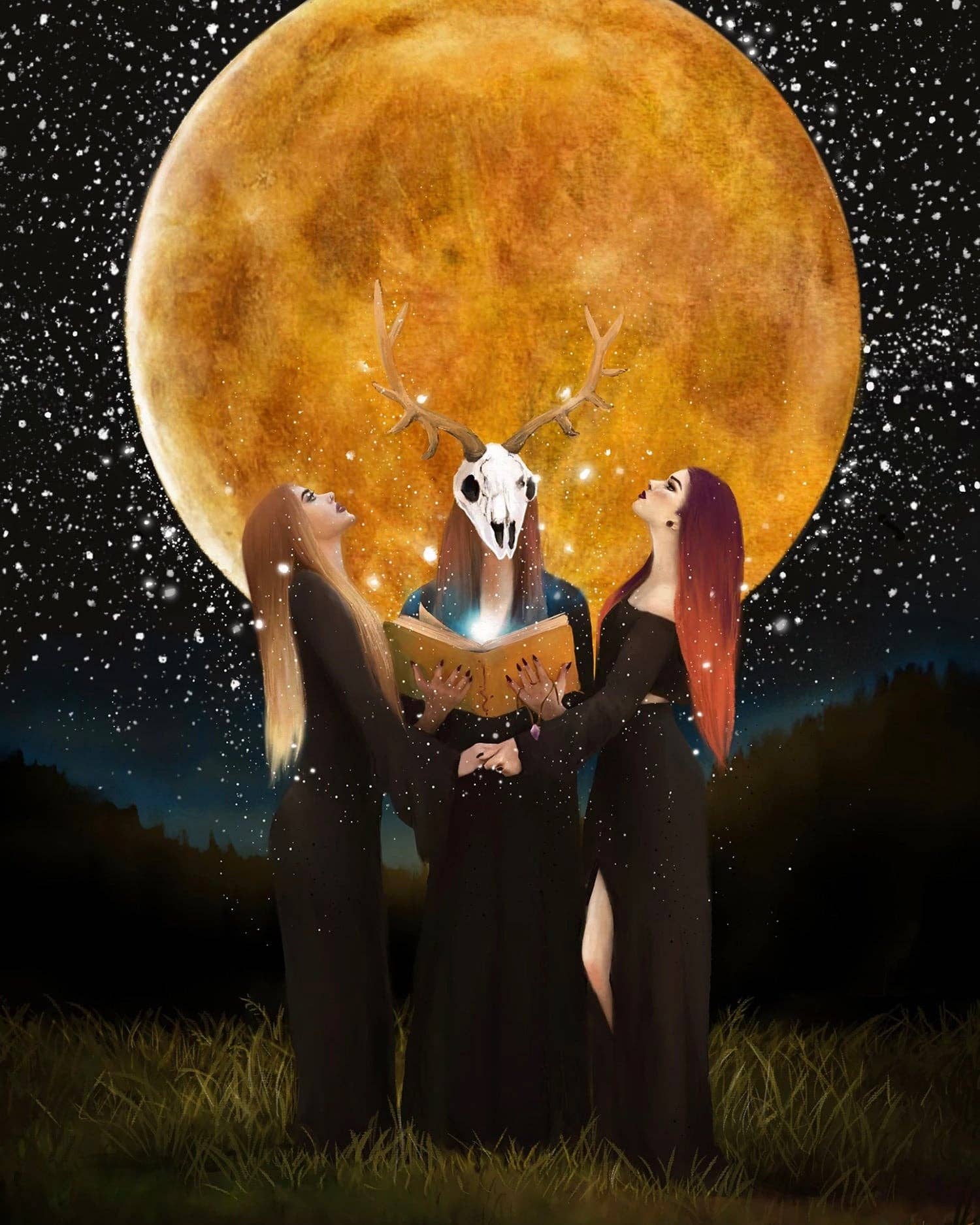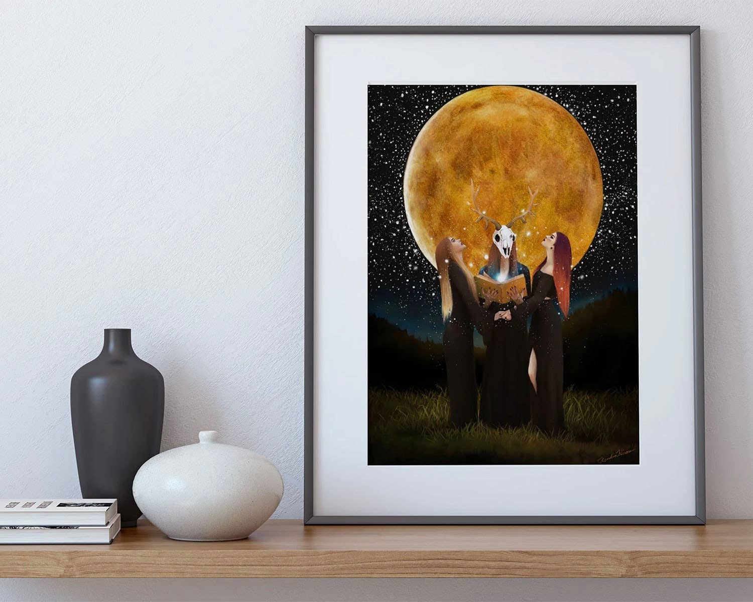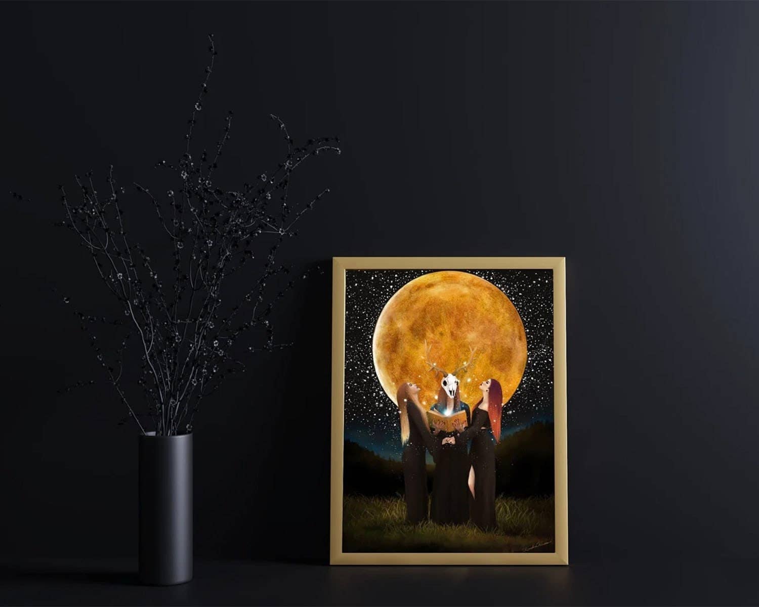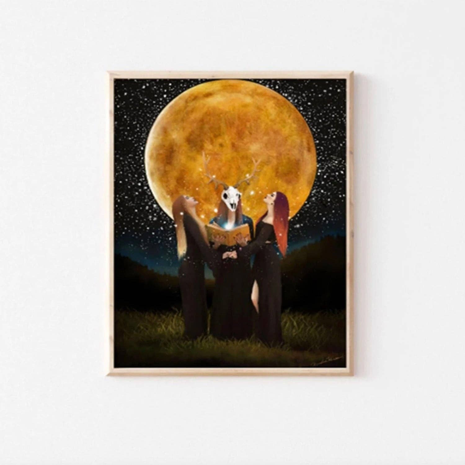 This coven of three women gather under the full, gold moon to celebrate with magic spells and charm all night long. Piece inspired by the Fall Equinox, and all of the witchy things that commence on that day. Also known as Mabon.