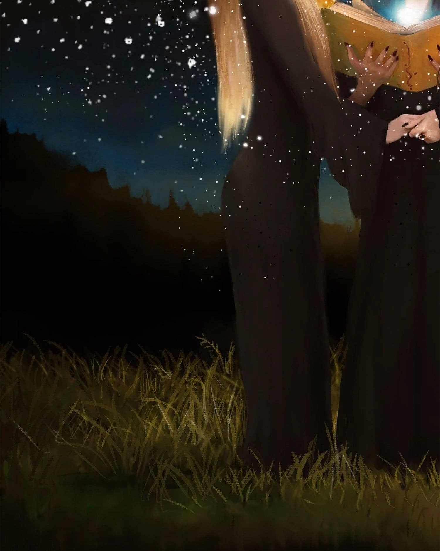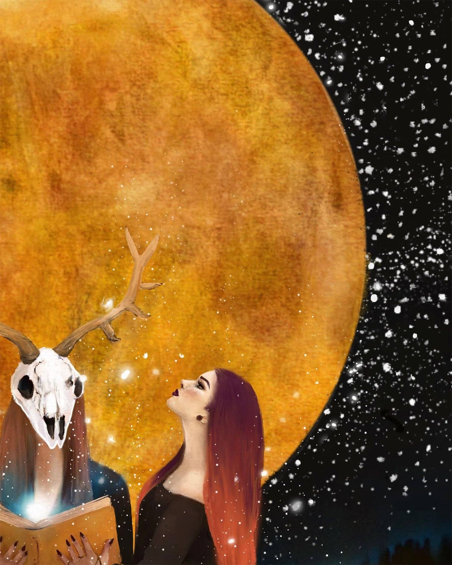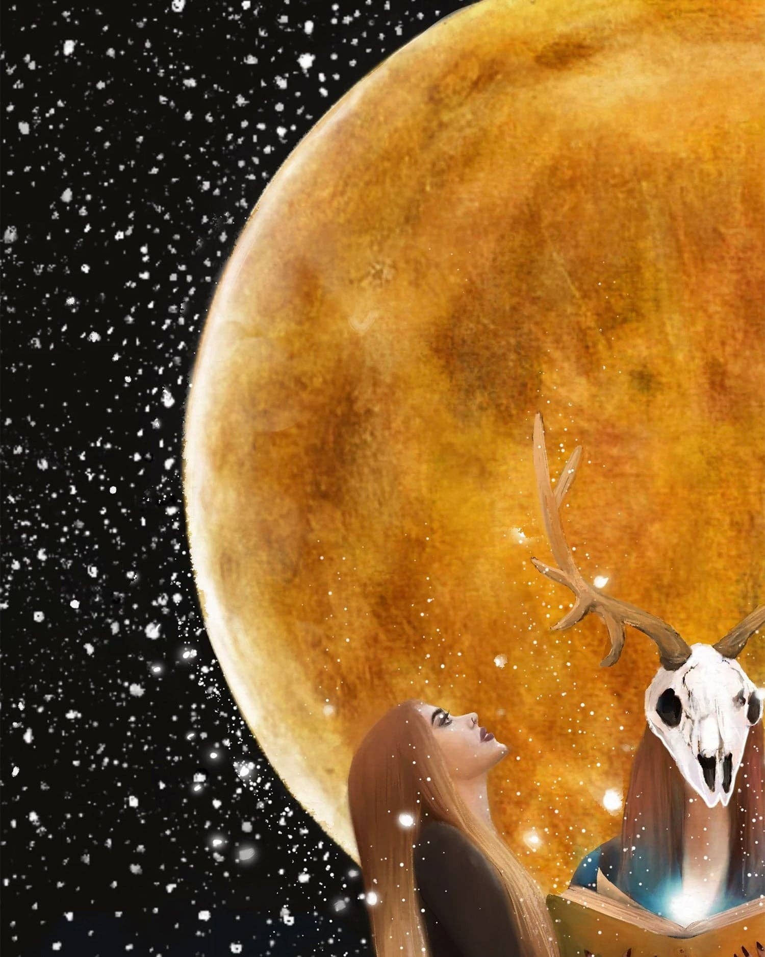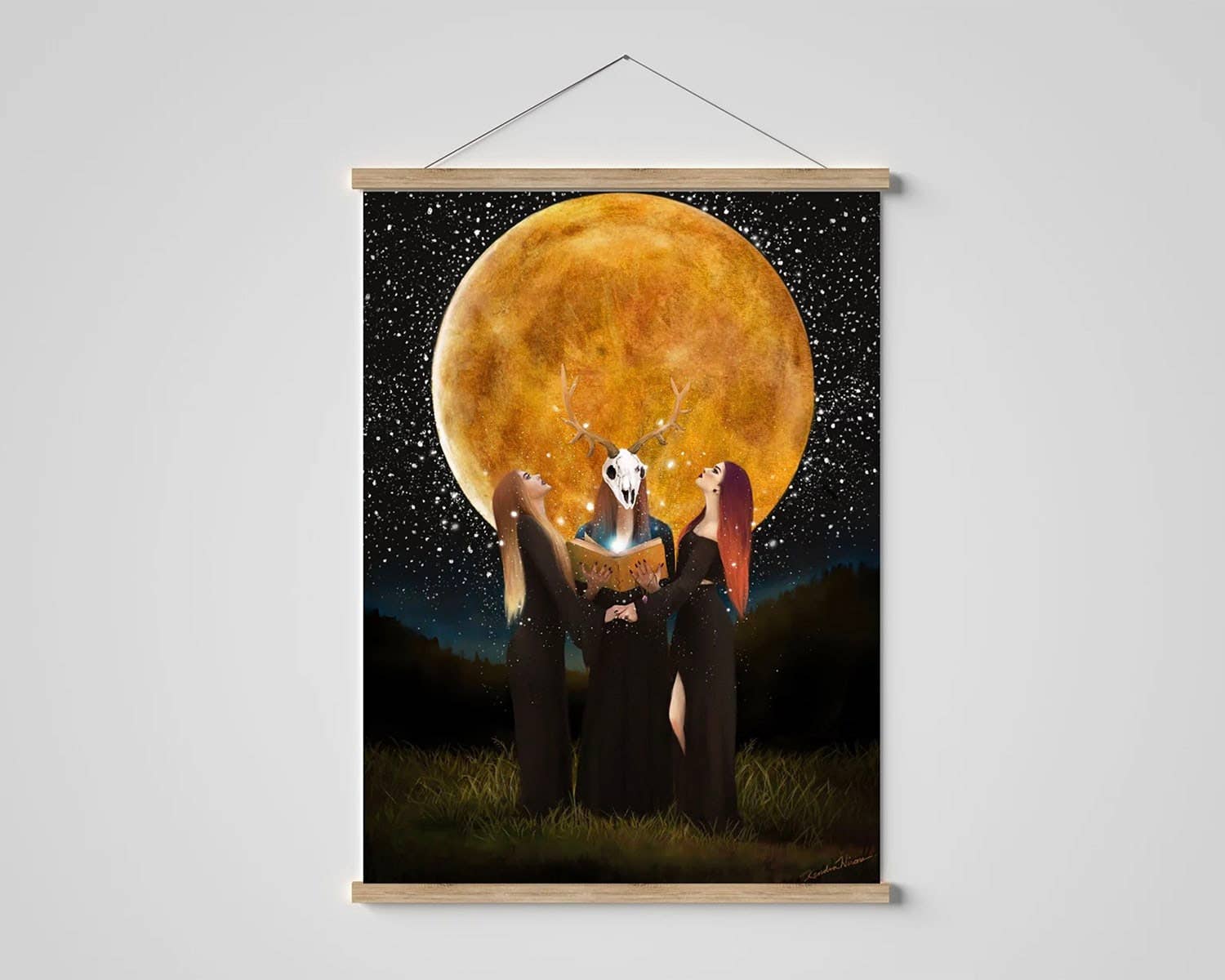 This coven of three women gather under the full, gold moon to celebrate with magic spells and charm all night long. Piece inspired by the Fall Equinox, and all of the witchy things that commence on that day. Also known as Mabon.