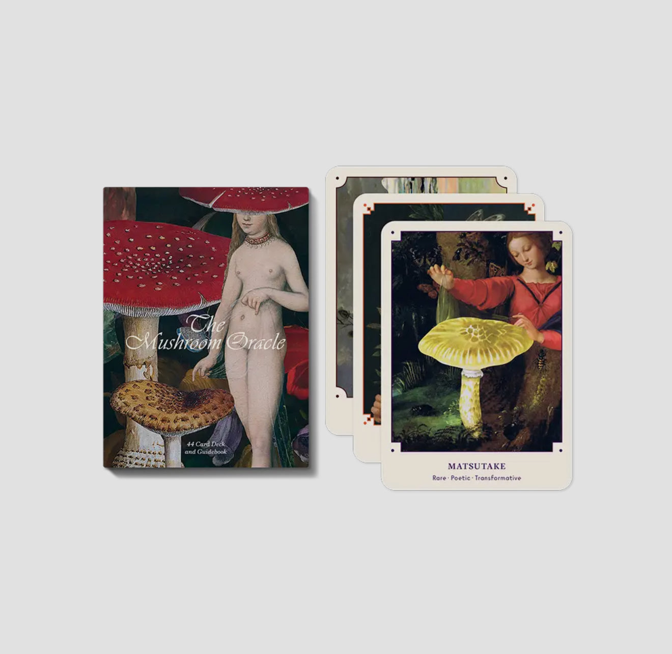 The Mushroom Oracle Deck guides mycelial thinking about the past, present, and future through 44 cards and an accompanying booklet representing mushrooms, the forest, mushroom people, and fungal structures—and the multitudes, layers, and connections each contains. Consult the Mushroom Oracle by pulling a card at new beginnings, forks in the path, closings, and seasonal transitions. A wonderful tarot alternative, the reader is encouraged to consider their connections to others, their environment, and themselves.