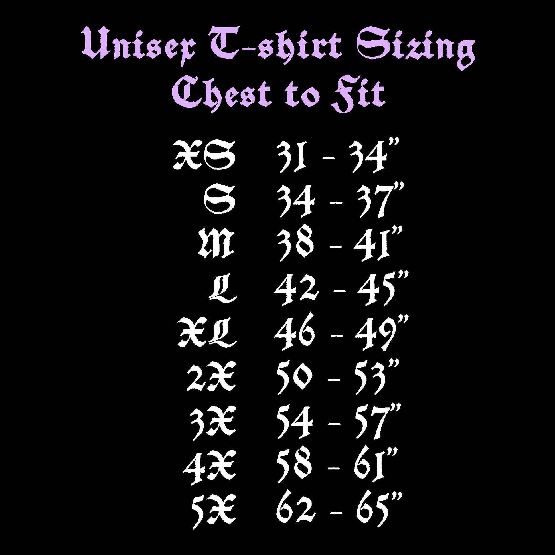 Imagery is screen-printed in Harrisburg, PA. Print is about 12 inches wide on all sizes Bella & Canvas 100% cotton black crew neck unisex T-shirt. Machine washable, but cool temp while laundering will help longevity. Sizing chart is the last image. Model is wearing a large.