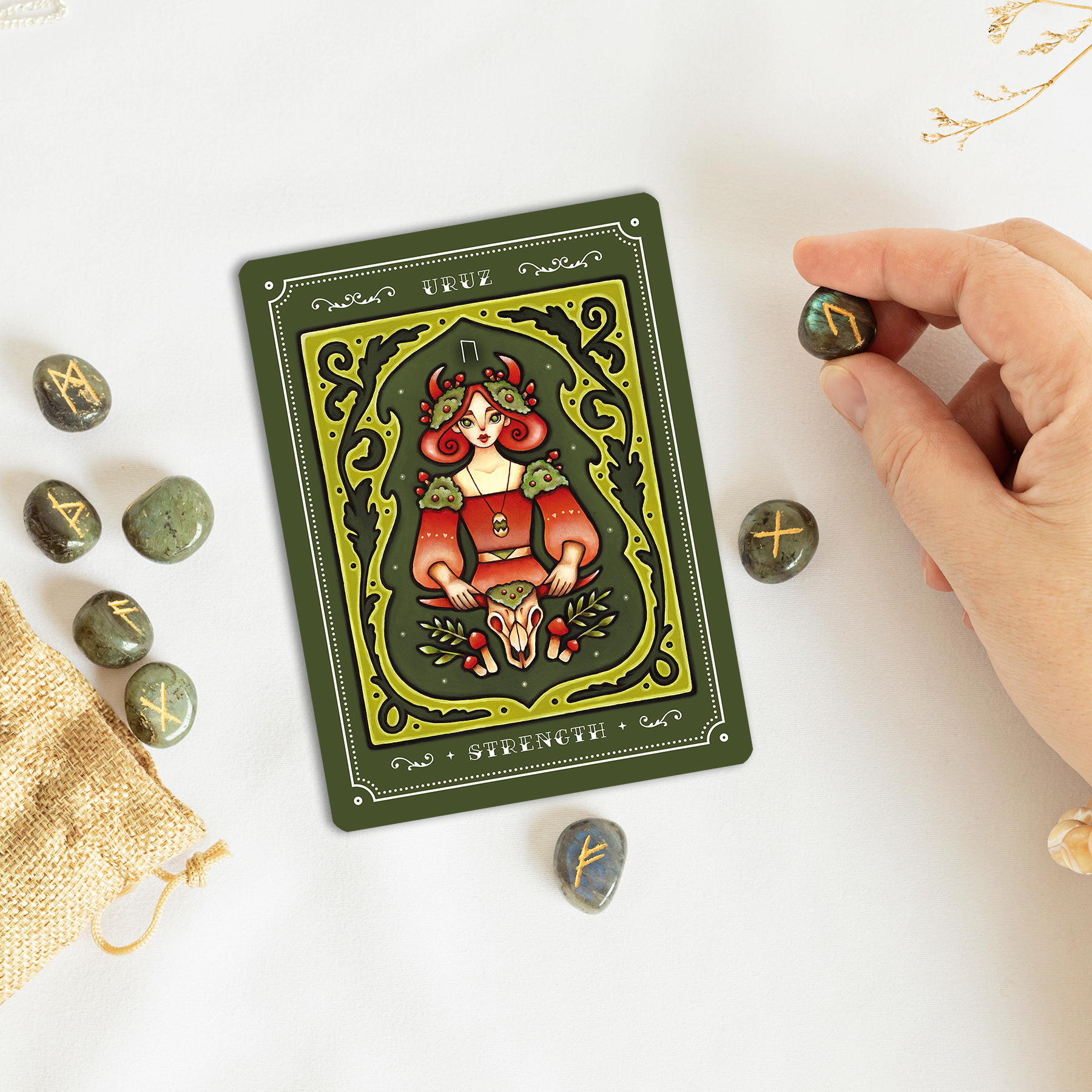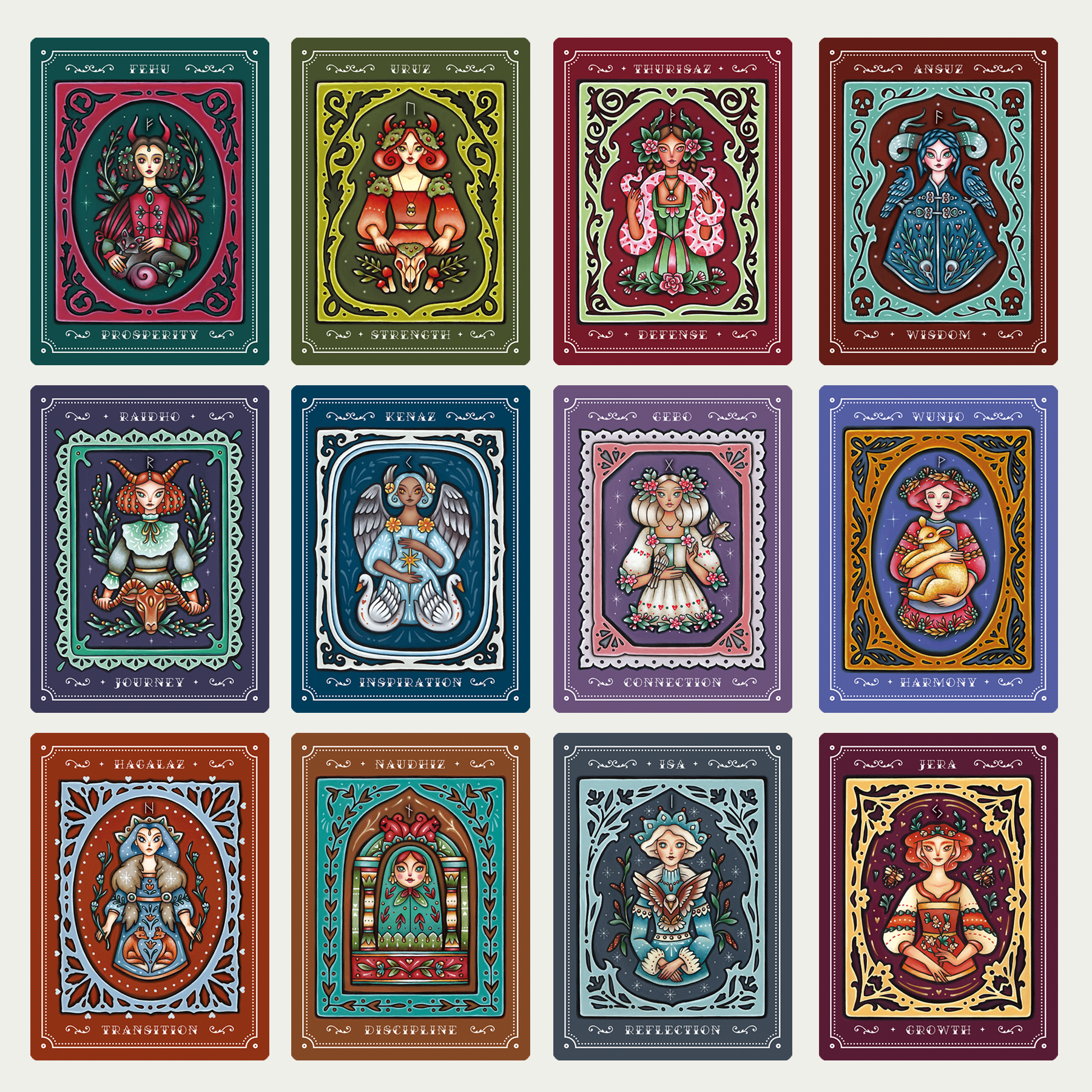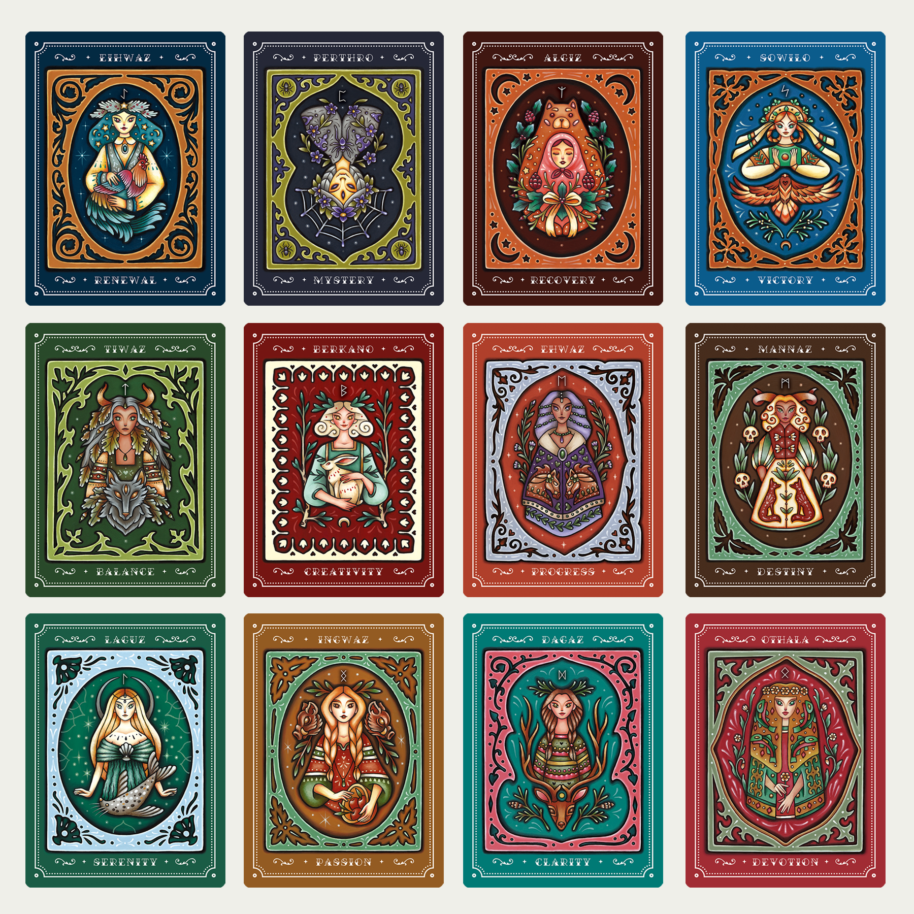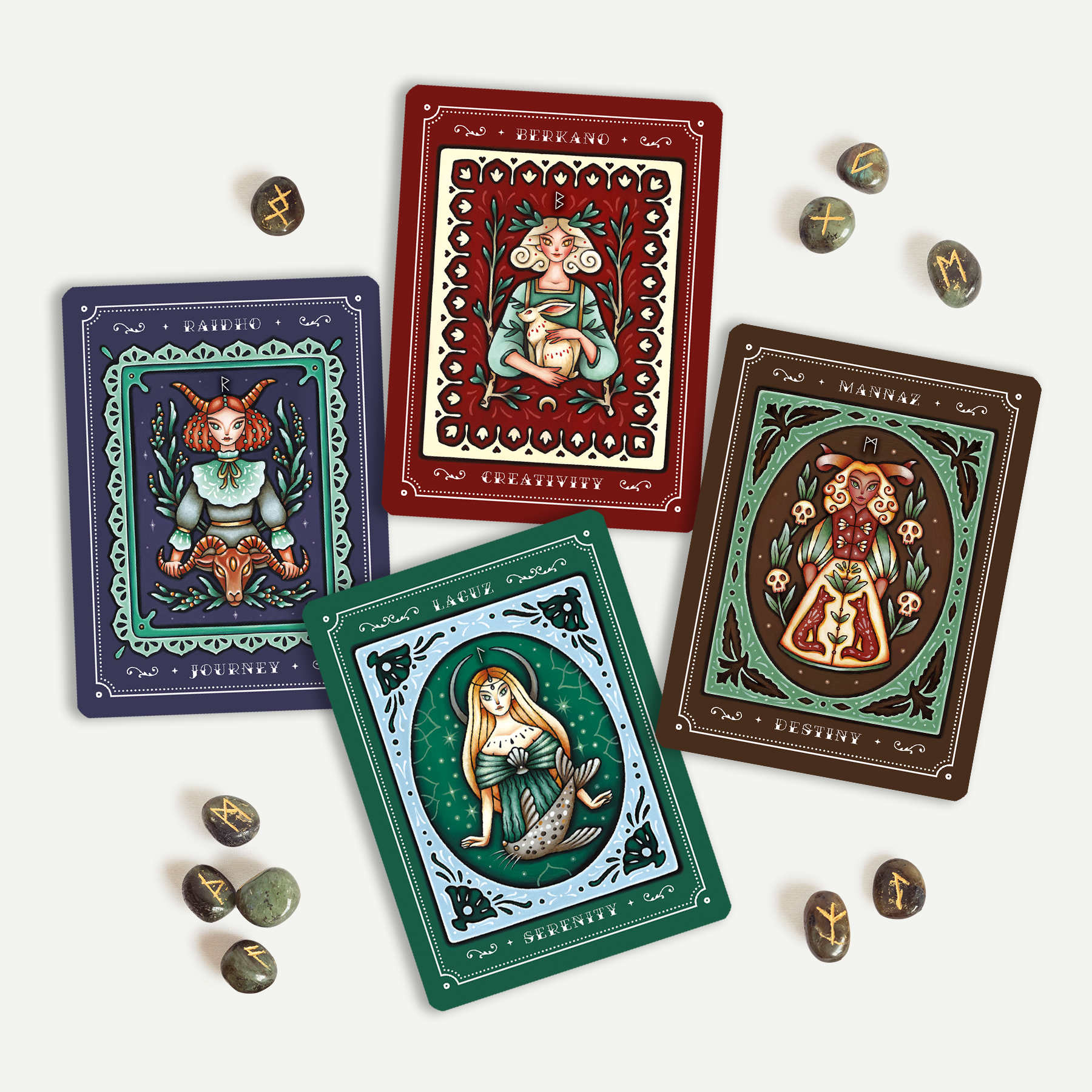 Delve into the depths of Norse mythology as you explore the symbiotic relationship between goddess, beast, and botanical wonder. From the fierce warriors of the battlefield to the gentle healers of the earth, each card weaves a story of empowerment, resilience, and wisdom. Each runic card is a masterpiece crafted by artist Faina Lorah, using the timeless tradition of oil on wood to breathe life into the realms of ancient mythology. Within every stroke of Lorah’s brush lies a sacred narrative, where the intricate dance between divine entities, animals, and plants unfolds.